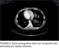FIGURA 2: Corte tomográfico axial con ocupación del etmoides por tejidos blandos.
