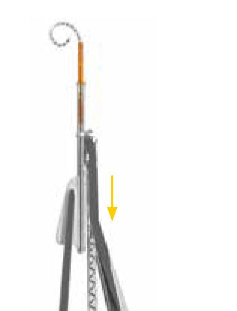 Retire la funda del electrodo limpiamente y hacia atrás con la pinza recta. Una vez se haya extraído la funda, suelte el electrodo que está sujetando con la pinza AOS y finalice la maniobra de inserción.