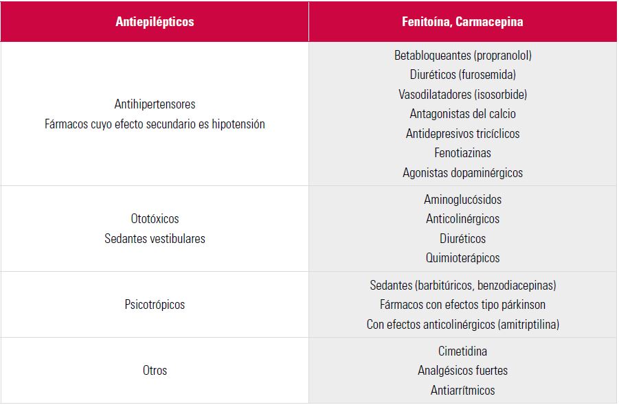 Fármacos que pueden causar inestabilidad y ataxia.