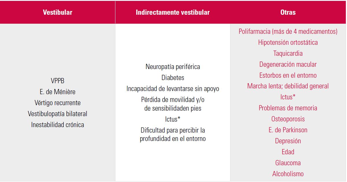 La diferencia fundamental estriba en que la mayoría de sus problemas no son «solo» de origen vestibular: es muy común la afectación multisensorial o puramente extra vestibular. Desde el punto de vista de la patología vestibular se ven formas comunes pero su frecuencia varía: el vértigo posicional es muy frecuente, mientras que la enfermedad de Ménière o la migraña vestibular, muy raras. En cuanto a la etiología, es también habitual encontrar varias, y muchas interrelacionadas de manera negativa: vértigo posicional e ingesta de hipotensores. No se debe descartar la existencia de factores de riesgo vascular y sus consecuencias: la enfermedad cerebral de pequeño vaso es muy frecuente y tiene consecuencias funestas en el equilibrio estático y sobre todo el dinámico, lo que limita de manera importante la rapidez y eficacia de las estrategias posturales de recuperación del equilibrio ante una súbita desestabilización. En los mayores no se debe olvidar que también los aspectos psicológicos y la enfermedad psiquiátrica pueden influir de forma negativa en su estabilidad.