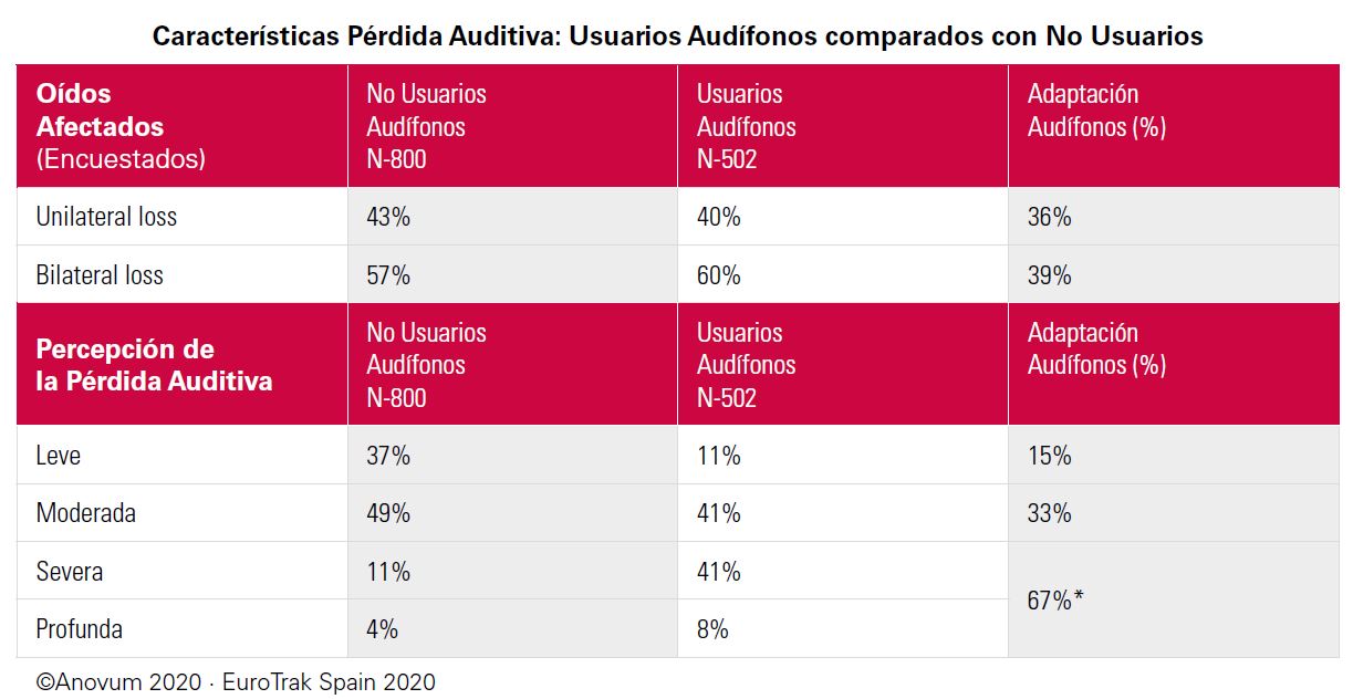 Características Pérdidas Auditivas usuario y no usuarios (fuente: Eurotrak 2020 SP ANA)