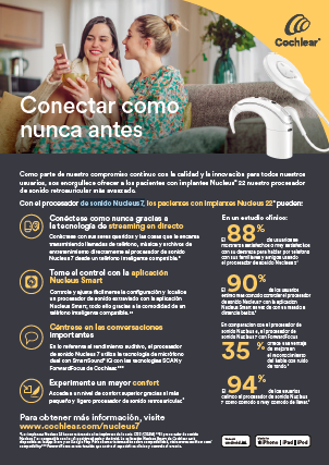 Cada persona es única y única debe ser también su solución auditiva. Con el procesador de sonido Cochlear™ Nucleus® 7, sus pacientes podrán oír a su manera con una conectividad y un control de primera clase directamente desde su smatphone*.