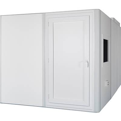 Consiste en una cavidad de cuatro paredes, suelo y techo, de dimensiones adecuadas para que el paciente pueda sentarse cómodamente, con puerta y cristal de visualización de paciente y caja de interconexión para equipos médicos de evaluación audiométrica.